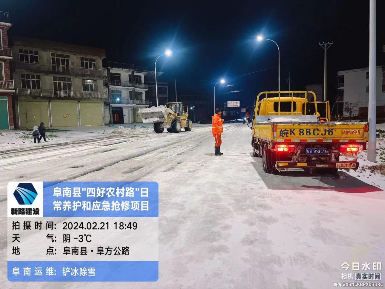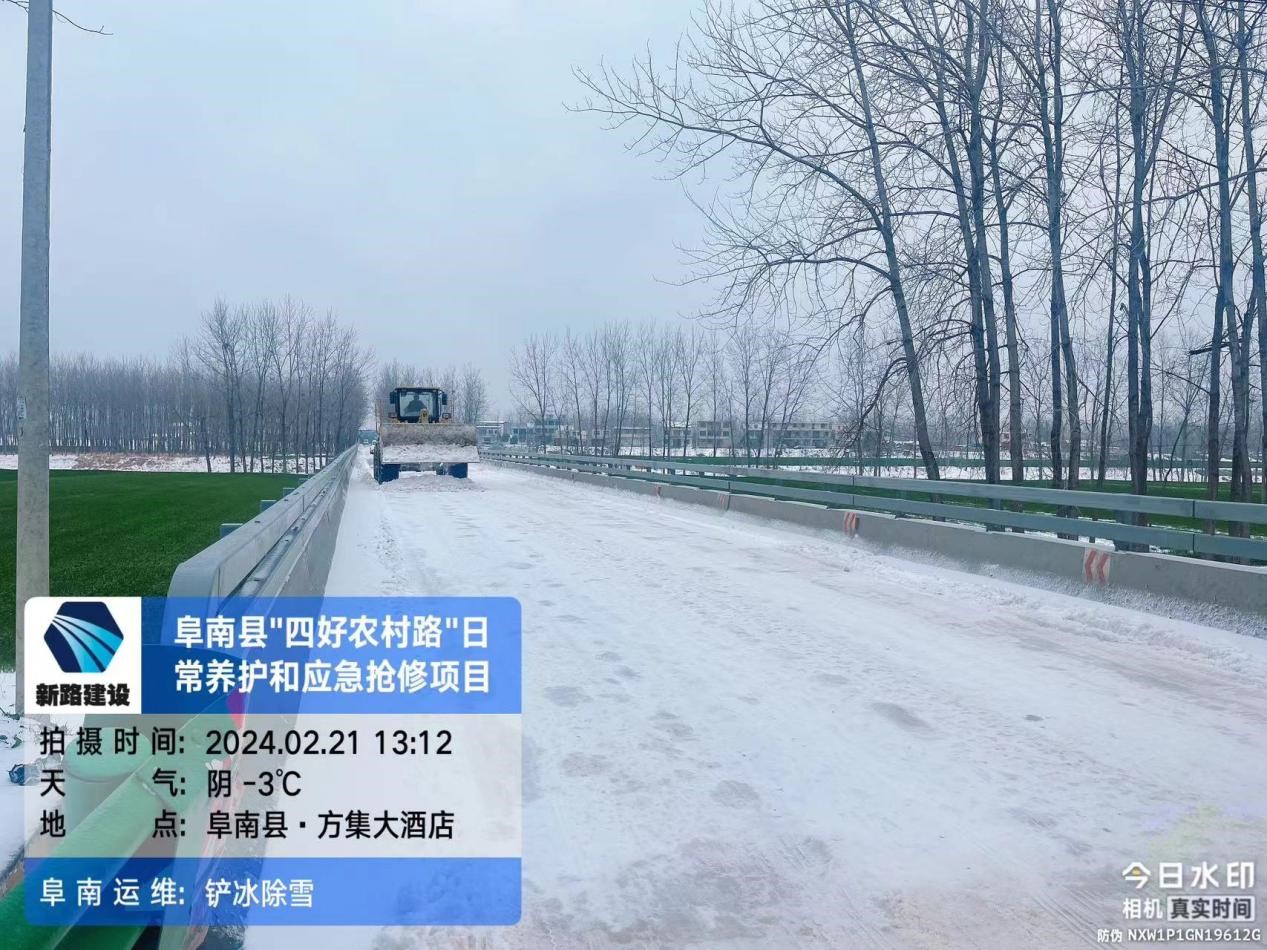 截止2月23日12时,阜南运维中心共计投入:人工95人次,出动巡查车辆16台班,除雪机械20台班,撒布工业盐及融雪剂120余吨,清除桥面积雪50余座,铲雪除冰道路里程长达180公里。