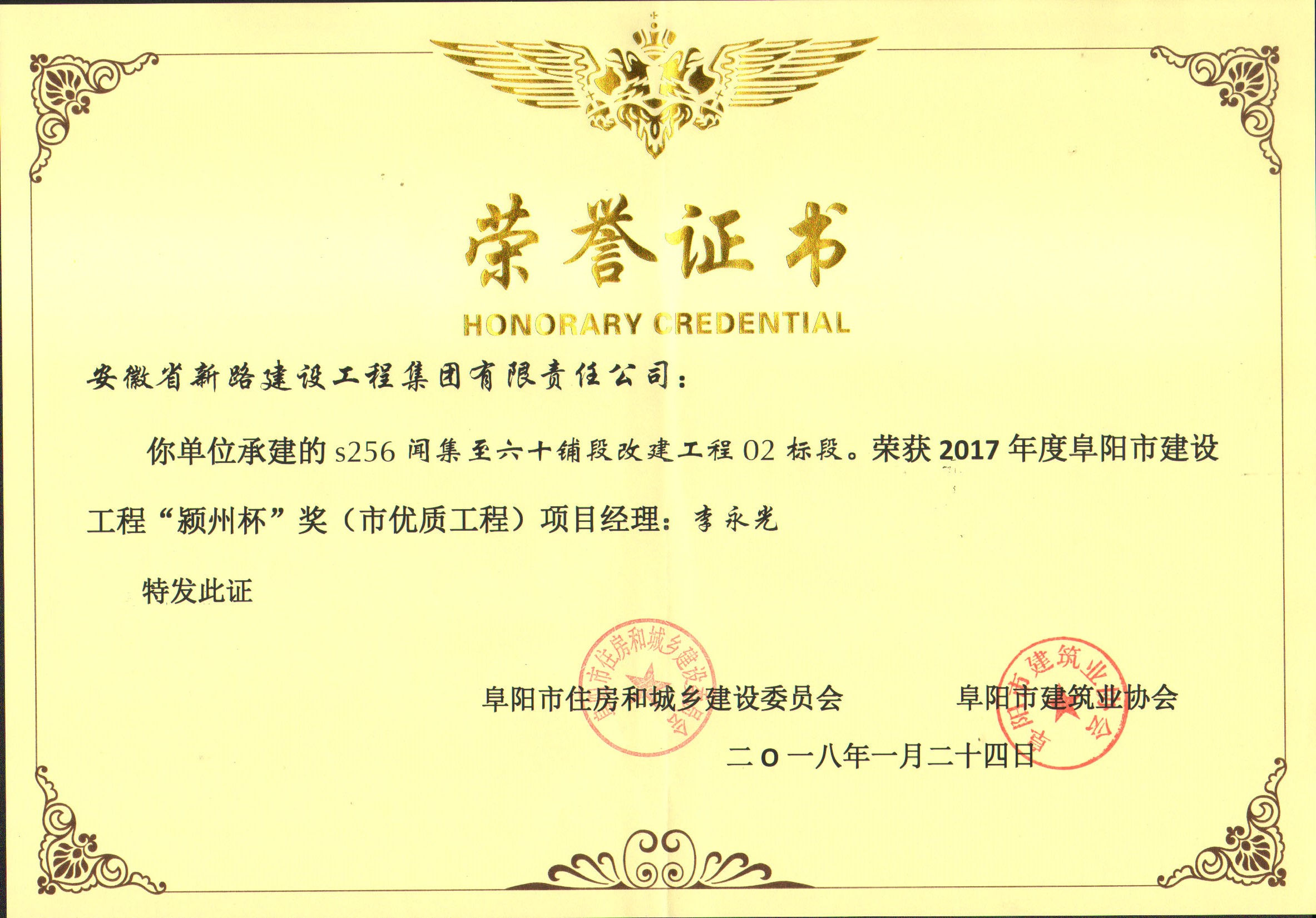S256闻集至六十铺段改建工程02标段颍州杯奖