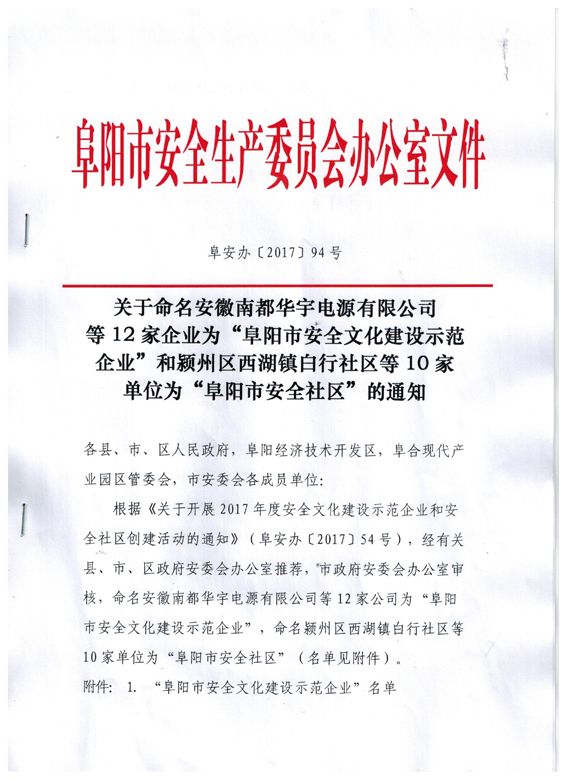 近日,阜阳市人民政府安委会印发了《关于命名安徽南都华宇电源有限公司等12家企业为“阜阳市安全文化建设示范企业”和颍州区西湖镇白行社区等10家单位为“阜阳市安全社区”的通知》(阜安办【2017】94号),伟德国际1946源于英国名列其中,荣获“阜阳市安全文化建设示范企业”称号。
