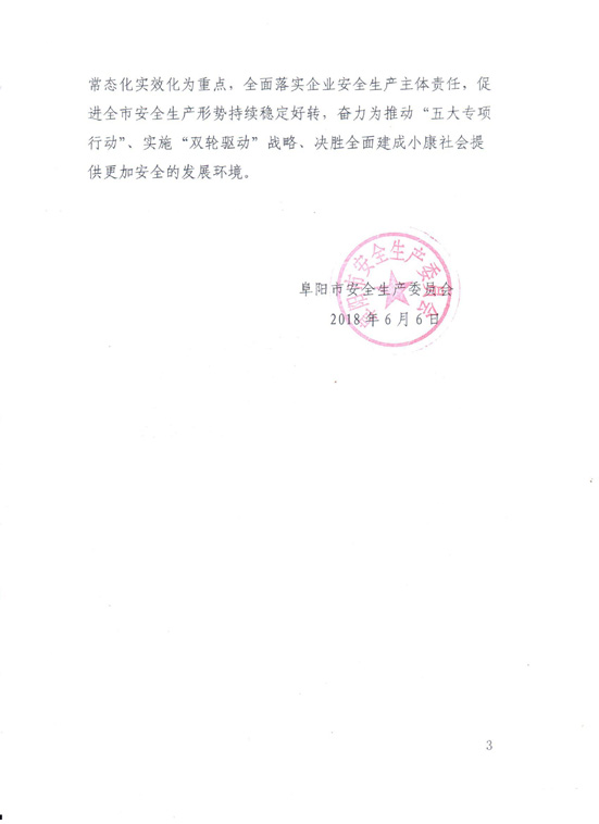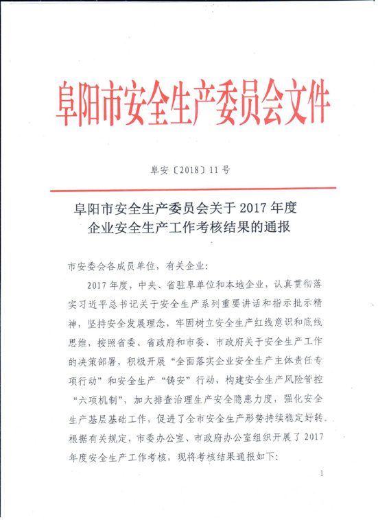 近日,阜阳市安委会印发了《阜阳市安全生产委员会关于2017年度企业安全生产工作考核结果的通报》(阜安【2018】11号)文件,伟德国际1946源于英国在2017年度全市安全生产目标管理考核中再次被评为 “安全生产优秀单位”。