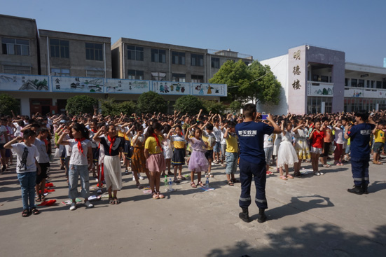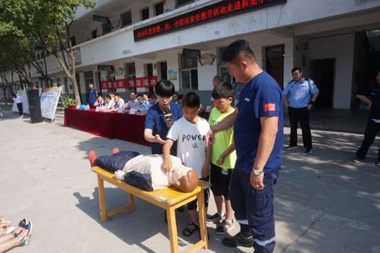 本次活动重点为学生们普及了防溺水、防中暑、消防等安全知识,以及遇到溺水、中暑等事故时,孩子们该采取何种方法自救以及救人的措施。蓝天救援队教官向孩子们普及了如遇突发事故,如何采取正确的方法进行互救,现场进行心肺复苏等急救常识演示,并与现场的孩子们互动,使学生们增强了安全防范意识和自我急救能力。程集镇派出所王警官向孩子们介绍了干粉灭火器的使用方法和注意事项,并现场演示了干粉灭火器的正确使用方法。