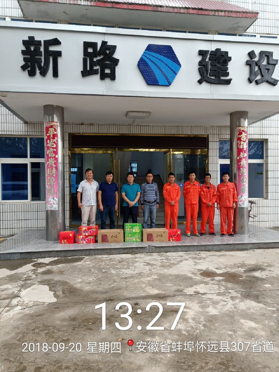 丹桂飘香时,月圆中秋到。在中秋佳节来临之际,集团公司董事长唐谦、总经理韩恒忠、副总经李超、崔勇、工会主席冯贺等公司领导分别慰问S305、怀远PPP 、一道河等10个在建项目,看望慰问奋战在施工一线的职工,带去了月饼、水果等慰问品,并向广大职工送上节日的问候和诚挚的祝福。