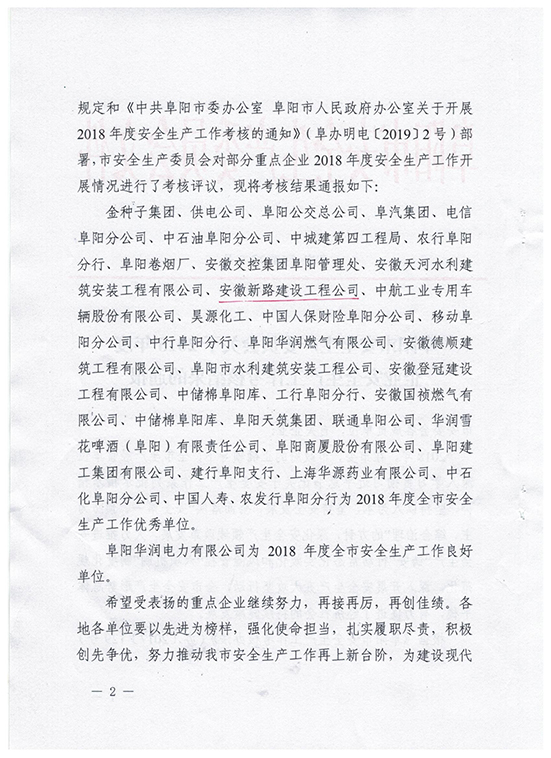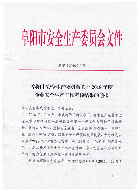 近日,阜阳市安委会印发了《阜阳市安全生产委员会关于2018年度企业安全生产工作考核结果的通报》(阜安【2019】9号)文件,安徽伟德国际1946源于英国建设集团在2018年度全市安全生产目标管理考核中再次被评为“安全生产工作优秀单位”。