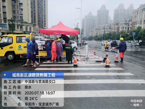汛期期间我部在阜阳市先后进行了九里安置区、航颍安置区、三清路与林颍路交口、中清路与三清路交口、南站路与三清路交口等多处市区涝点的排水工作以及城南新区韩老庄村和迎水村的农田排水工作。并在阜南县经开区对园区涝点、堵点进行排查、疏通、清淤等综合治理,对管道排水能力不足的路段增设管道,从根本上提高园区排水能力。发现路面出现积水时,连夜组织排水,保障居民出行不受影响。