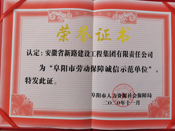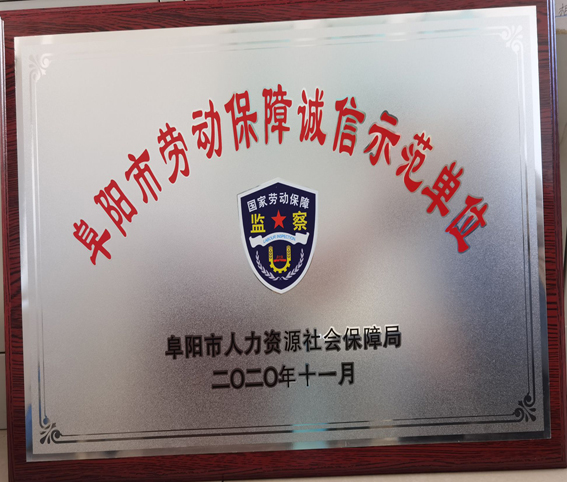 日前,经阜阳市人力资源和社会保障局评选,集团公司在众多企业中脱颖而出,荣获2020年度“阜阳市劳动保障诚信示范单位”称号,也是阜阳市经济开发区唯一一家获奖单位。