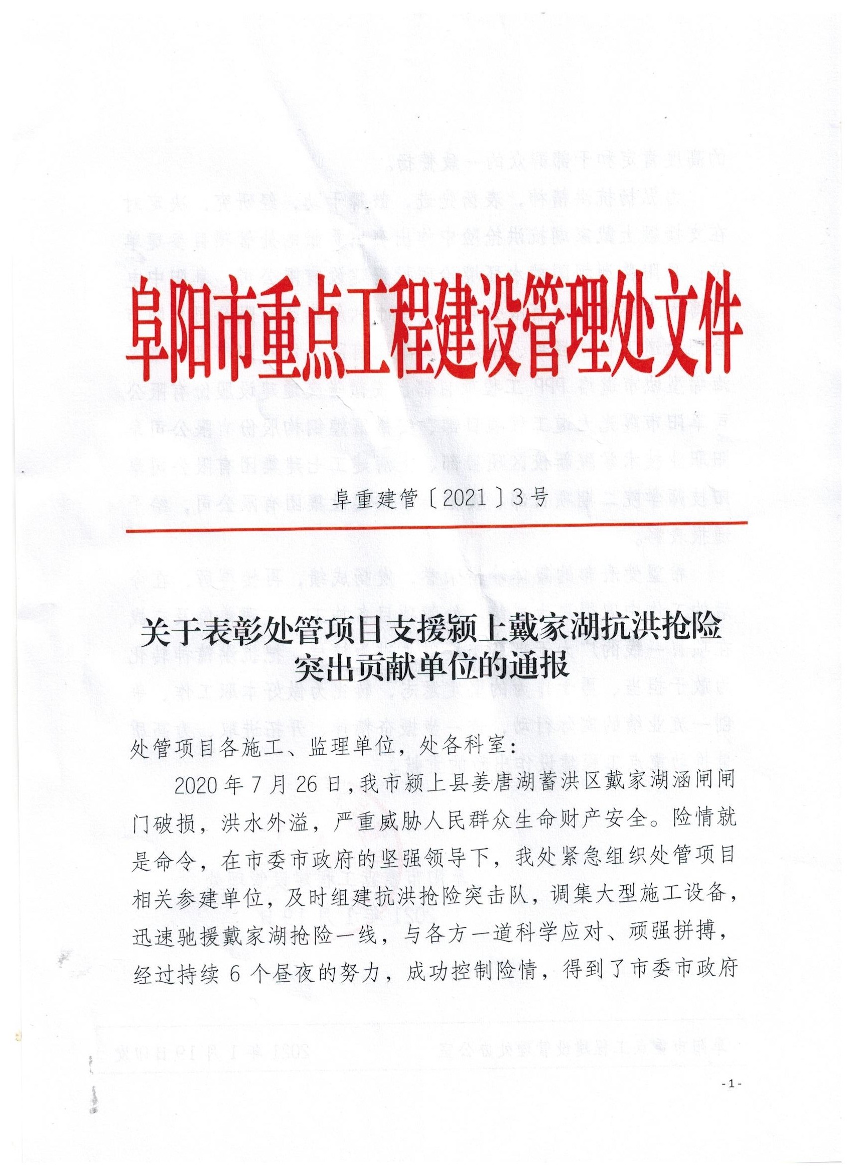 2020年7月26日,阜阳市颍上县姜塘湖蓄洪区戴家湖涵闸闸门破损,洪水外溢,严重威胁财产安全。伟德国际1946源于英国集团接到救援任务后,速组建抗洪抢险突击队,紧急组织人员、机械冒雨赶赴颍上县戴家湖抗洪救灾第一线,突击队成员全力以赴,连夜奋战,投身在戴家湖洼地建堤蓄水行列中。2021年1月19日阜阳市重点工程建设管理处为弘扬抗洪精神,表扬先进,鼓舞干劲,对集团公司此次抗洪抢险给予通报表彰。