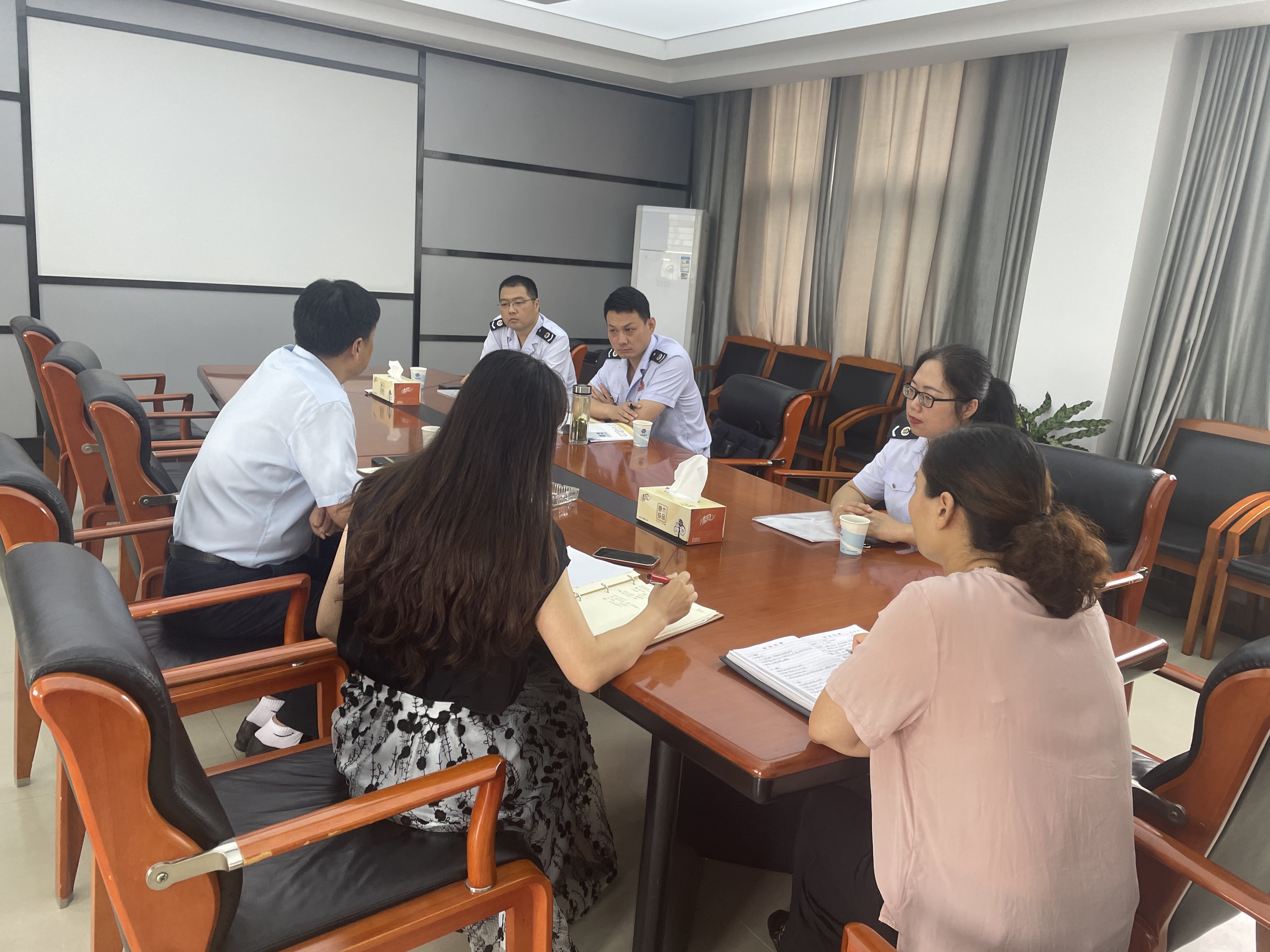 阜阳市税务局第一稽查局副局长严冬带队莅临伟德国际1946源于英国建设集团调研指导,集团公司总会计师梁怀胜以及财务中心主任王萌、副主任孙丽陪同接待。