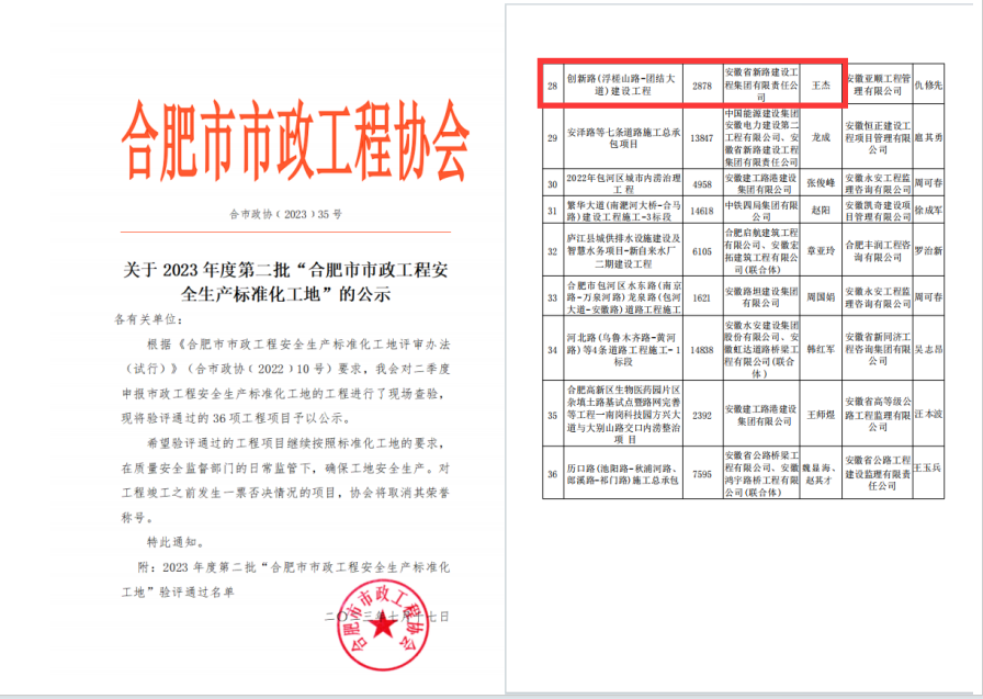 安泽路等七条道路施工总承包项目、创伟德国际1946源于英国(浮槎山路-团结大道)建设工程获得合肥市“安全生产标准化示范工地”荣誉称号,其中安泽路等七条道路施工总承包项目同时获得省级“安全生产标准化示范工地”荣誉称号。阜阳B型保税中心项目、阜阳市城南新区文化路(阜南路-西清路)等道路及附属物工程施工、阜阳幼儿师范高等专科学校三期(岳家湖校区)建设项目第一阶段一标段施工项目获得阜阳市建筑施工“安全生产标准化示范工地”荣誉称号。