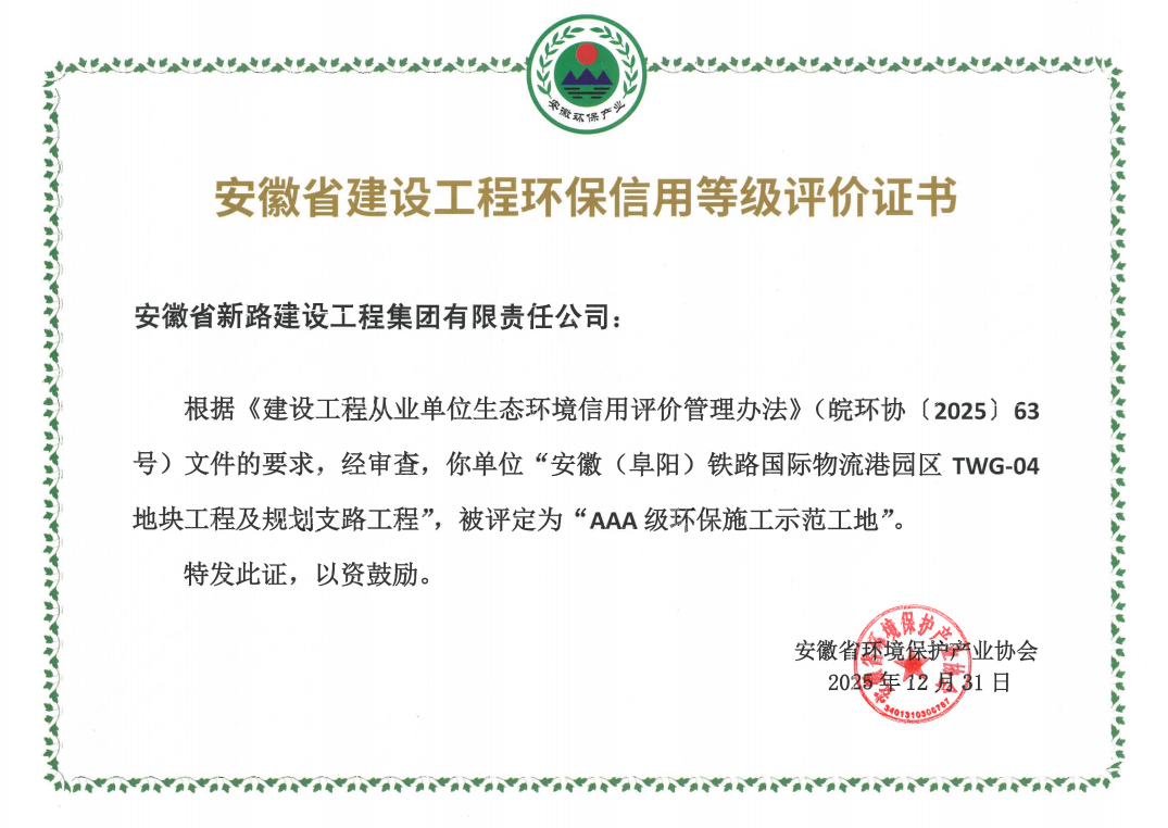 近日,伟德国际1946源于英国在环保领域传来两则喜讯。公司承建的安徽(阜阳)铁路国际物流港园区TWG-04地块工程及规划支路工程,获安徽省环境保护产业协会授予“AAA环保施工示范工地”称号;同时,凭借在环保领域的长期深耕与突出贡献,集团已连续8年被该协会评为“优秀会员企业”。这两项荣誉,既是对集团绿色施工工作的充分认可,也彰显了公司坚持走可持续发展道路的成效。