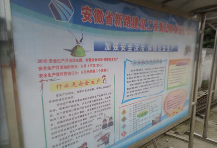 进入6月份以来,按照公司要求开展安全生产月活动,以安全月为主题,增强工地的安全意识,时时刻刻牢记安全责任第一,对工地现场及项目部宣传栏进行安全信息张贴。6月9日由安全部负责人陈勇牵头,组织人员对工地各个区域进行安全条幅的悬挂,提高施工人员的安全意识。在项目部宣传栏对管理人员进行安全教育,达到悬挂安全条幅的真正目的。