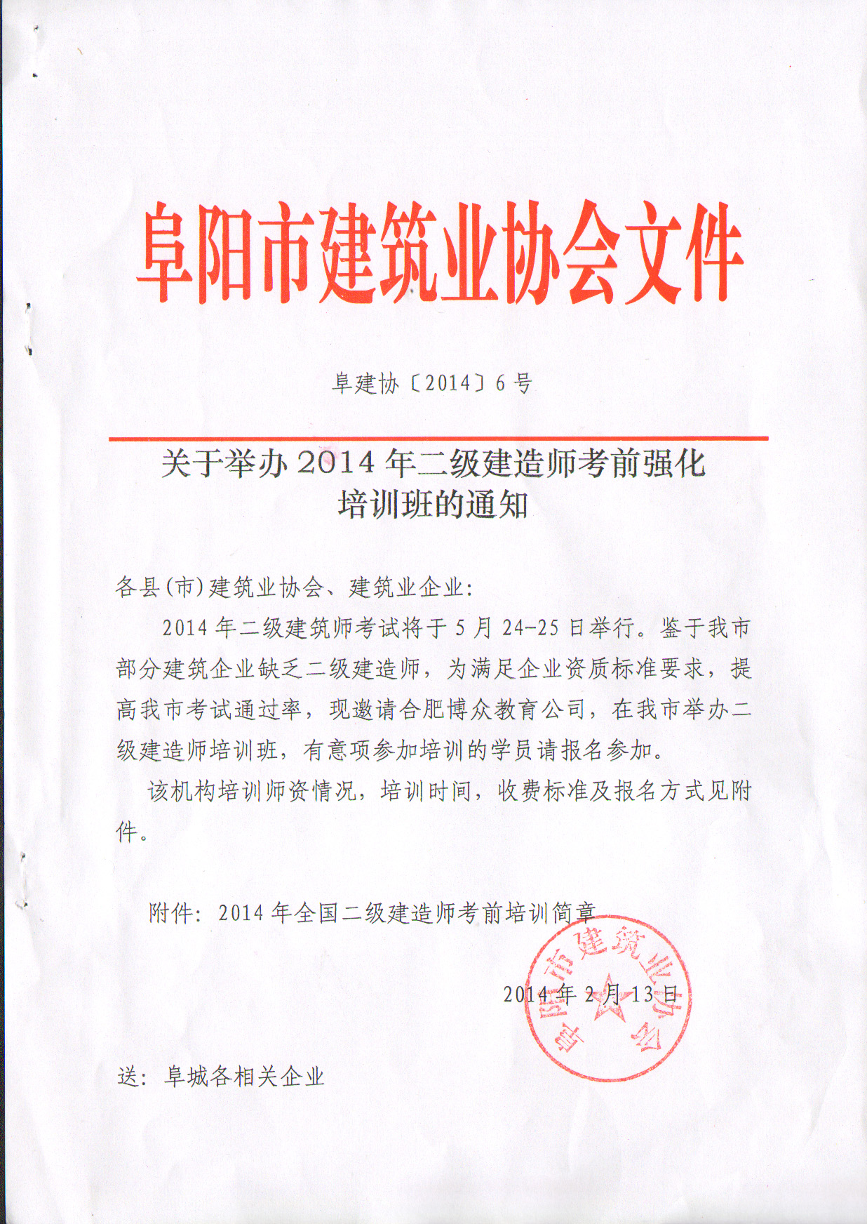 接阜阳市建筑业协会《关于举办2014年二级建造师考前强化培训班的通知》(请点击查看)文件通知,阜阳市建筑业协会邀请合肥博众教育公司在我市举办二建考前培训强化班,培训时间、费用、报名等详情请参考附件《全国二级建造师考前培训简章》(请点击查看),2月28日前报名赠送考试用书及习题,如需报名请于桑叶联系。