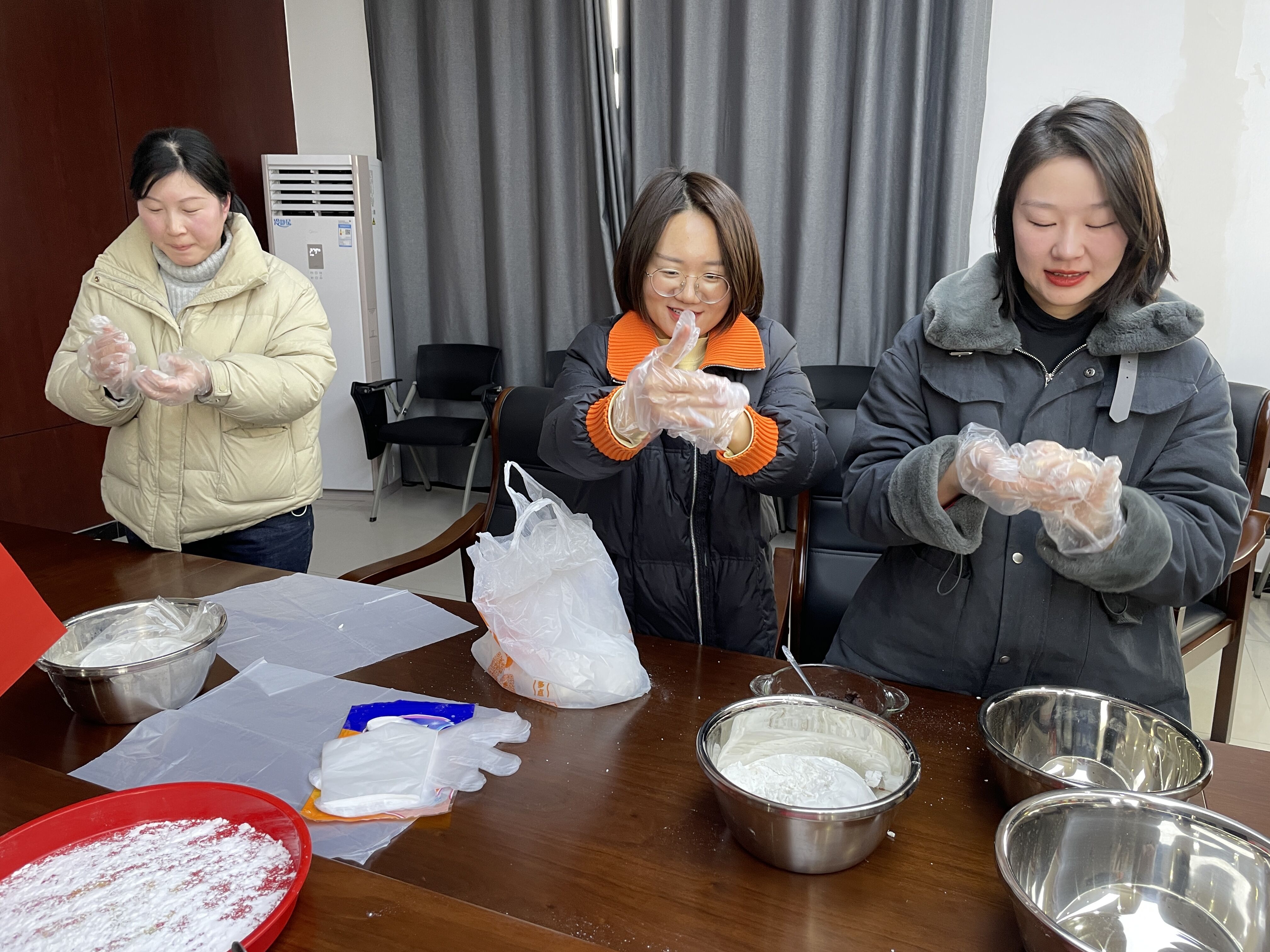 在灯笼做好之后,大家一起动手包起了汤圆。有的揉面、有的拌馅、有的搓汤圆……大家分工合作,在有说有笑的气氛中,一个个雪白的汤圆很快出炉。