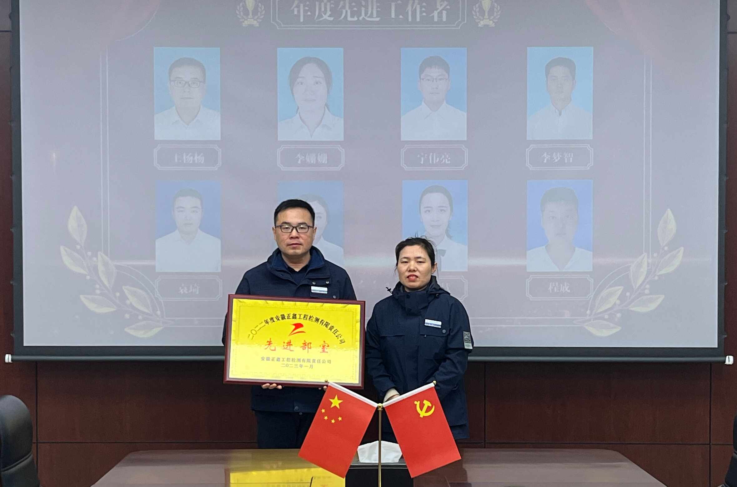 公司经理助理张曼为先进部室颁发奖牌