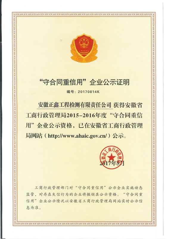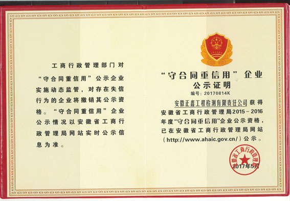 经过安徽省工商行政管理局的严格评定,正鑫检测公司获得省级“守合同重信用”企业荣誉称号。这是公司继获得市级“守合同重信用”企业称号后,获得的更高级别的荣誉。