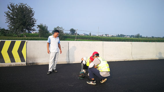 中心试验室根据《305省道阜南长安至曹集改建工程》设计文件及规范要求对01标沥青混凝土中面层施工的集料原材含泥量、压碎值,沥青针入度、软化点、延度,沥青混合料的油石比、空隙率、饱和度、稳定度等各项指标进行检测,并对其压实后的路面压实度、渗水等指标进行现场实体检测,层层把关,层层控制。